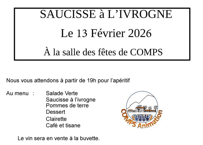 SAUCISSE à L’IVROGNE :Le 13 Février 2026 à 19h 29 janvier 202629 janvier 2026 Sylviane MASSON Aucun commentaire bulletin-Saucisse-ivrogne-2026-formulaireTélécharger Étiqueté avec Comps Animation accueil