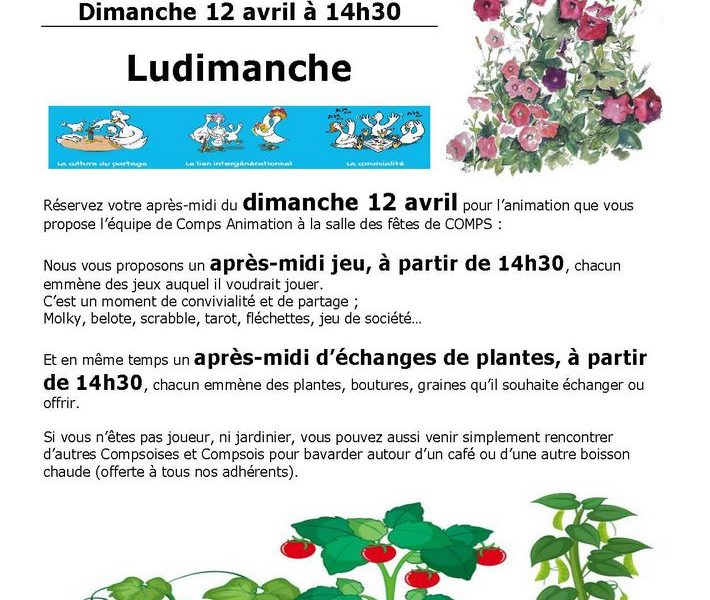 Bourse aux plantes et Ludimanche organisés par Comps Animation, plus d’informations sur : http://compsanimation26.free.fr/?Ludimanche-et-bourse-aux-plantes,137